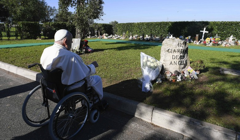 Najprv sa zastavil v Záhrade anjelov, v priestore venovanom pochovávaniu detí, ktoré neuzreli svetlo sveta. Pomodlil sa pred náhrobnými kameňmi obklopenými hračkami a soškami a pozdravil aj otca, ktorý stratil dcéru.