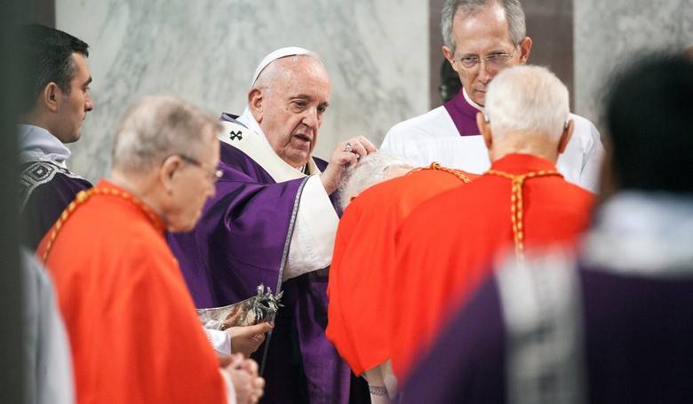 Svätý Otec František udeľuje popolec počas svätej omše v Bazilike sv. Sabíny v Ríme. Snímka: profimedia.sk