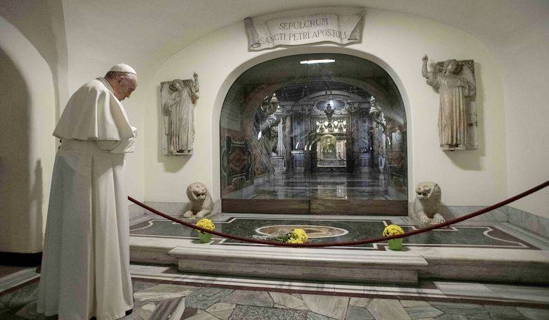 Svätý Otec František 2. novembra myslel i na duše zosnulých pápežov. Na snímke sa modlí pri hrobe prvého pápeža – svätého apoštola Petra. Snímka: profimedia.sk