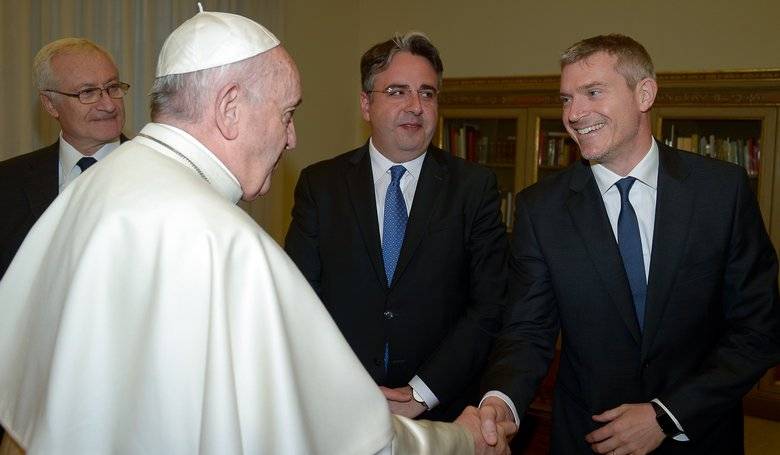 Matteo Bruni, prvý sprava, so Svätým Otcom Františkom. Snímka: profimedia.sk