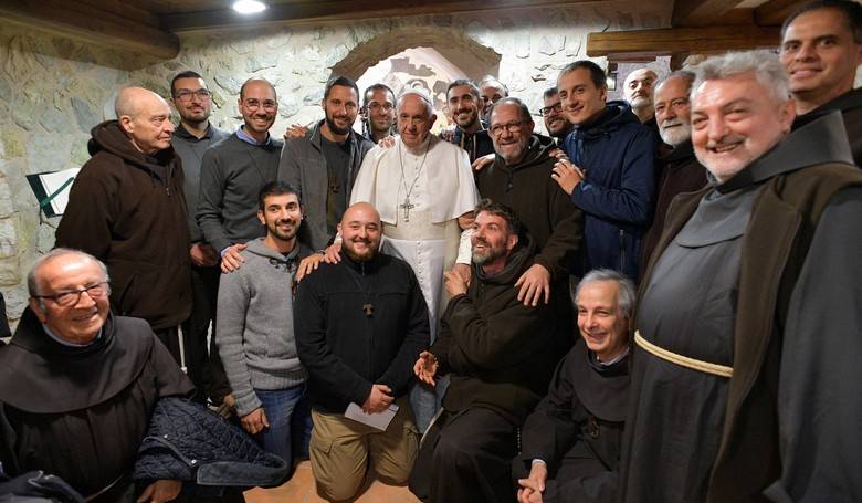 Pápež František s františkánmi v jaskynke vo Svätyni v Greccio. Snímka: profimedia.sk