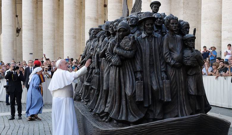 Po svätej omši Svätý Otec pozdravil veriacich na celom námestí. Na jeho okraji pri ľavom oblúku kolonády odhalil monumentálne súsošie znázorňujúce utečencov so symbolom krídel anjelov. Dielo kanadského umelca Timothyho Schmaltza je vytvorené z hliny a bronzu a zobrazuje husto natlačený zástup mužov a žien na podstavci pripomínajúcom čln, s tvárami rôznych etník a kultúr súčasnosti i minulosti.
