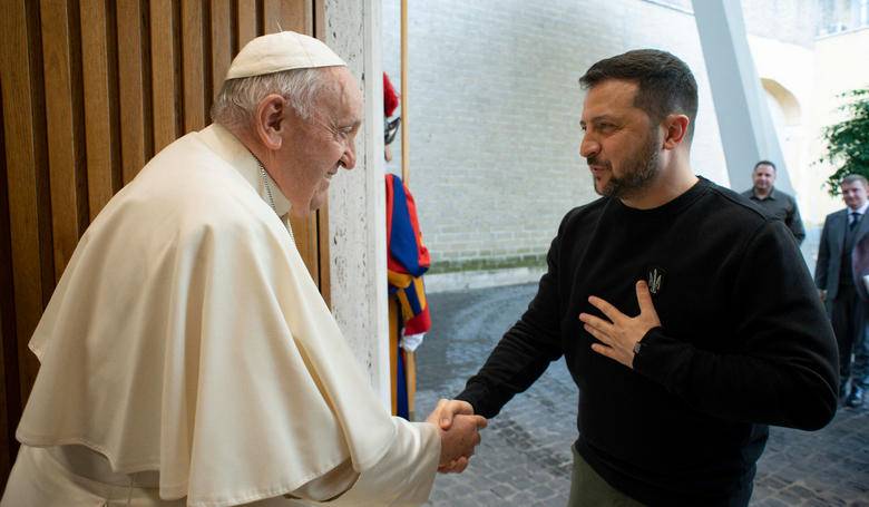 Prezident Ukrajiny priniesol ako dar umelecké dielo z nepriestrelnej dosky a obraz s názvom Straty, pripomínajúci deti zabité počas vojny. Stretnutie bolo súčasťou cesty ukrajinského prezidenta do Ríma, kde sa stretol s prezidentom Talianskej republiky Sergiom Mattarellom a predsedníčkou vlády Giorgiou Meloniovou.
