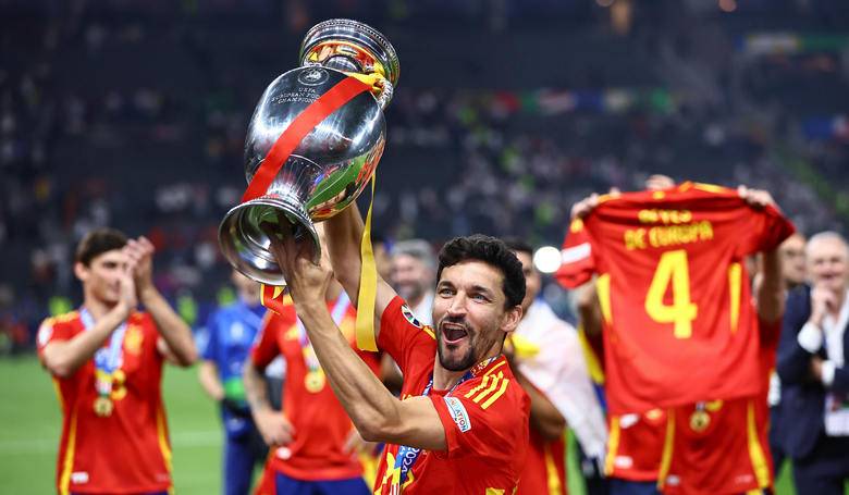 Jesús Navas (38) sa s trofejou v rukách teší z víťazstva španielskeho tímu na tohtoročných ME vo futbale. Veterán tímu rovnako slávil víťazstvo aj na MS v roku 2010, keď mal na teniskách nápis Boh je láska. Snímka: profimedia.sk