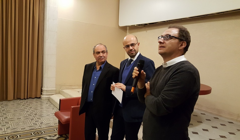 Autori dokumentárneho filmu s účinkujúcimi a hosťami premietania. S mikrofónom v ruke sa prihovára filmovy kritik Federico Pontiggia. Snímka: Jozef Bartkovjak SJ