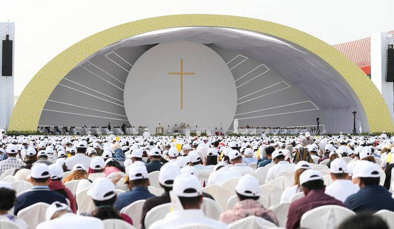 Tridsaťtisícovému bahrajnskému štadiónu v meste Riffa dominoval veľký symbol Eucharistie. Na svätú omšu prišli veriaci zo štyroch krajín apoštolského vikariátu pre Severnú Arábiu – Bahrajnu, Kuvajtu, Kataru a Saudskej Arábie, ale aj z ďalších krajín Perzského zálivu a iných území. Zastupovali stojedenásť rôznych národností. Snímka: profimedia.sk