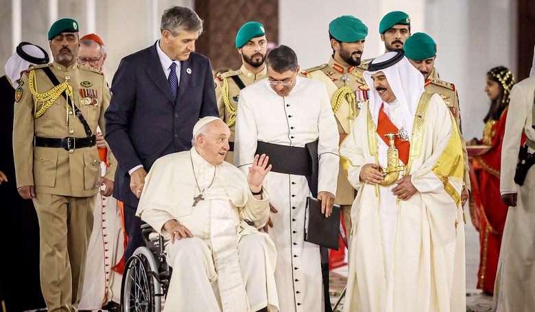 V kráľovskej rezidencii sa Svätý Otec prihovoril bahrajnským verejným predstaviteľom a diplomatom. Pripomenul, že krajina bola vždy miestom stretávania národov. Citoval slová Deklarácie Bahrajnského kráľovstva a povzbudil, aby ľudia „odmietli to, čo nás rozdeľuje, a sústredili sa, naopak, na to, čo nás spája“.