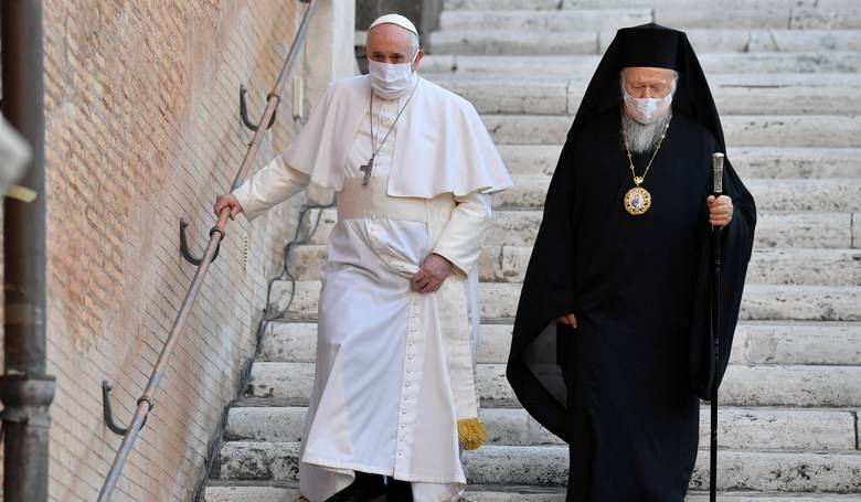 Aj pápež František s patriarchom Bartolomejom sa chránia rúškom. Snímka: profimedia.sk