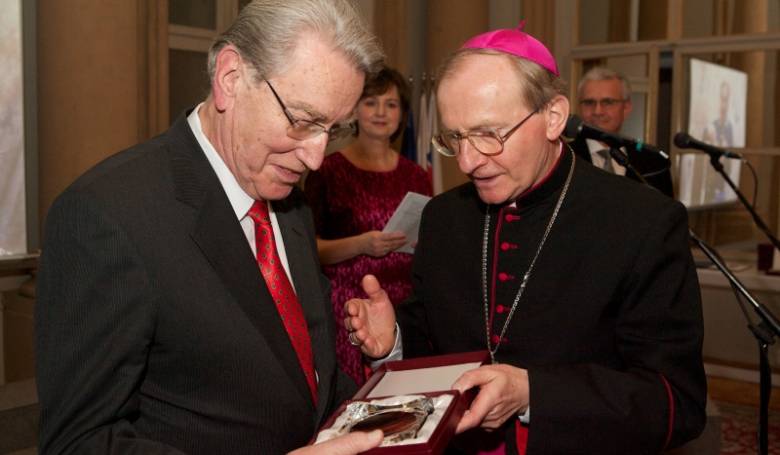 Anton Hykisch pri preberaní Ceny Fra Angelica z rúk biskupa Františka Rábeka vo februári 2014. Snímka: -TK KBS-/Peter Zimen