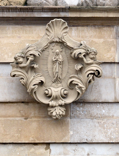 - súčasťou stĺpového súsošia sú okrem detailnej výzdoby tiež erby: erb biskupa Štefana Dolného, erb mesta Trnavy, erb Uhorského kráľovstva a emblém Panny Márie Immaculaty