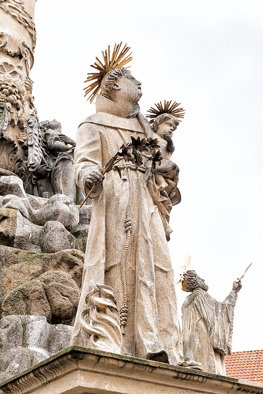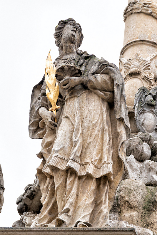 - na štvorhrannom základe sú v rohoch sochy sv. Floriána, sv. Agáty, sv. Františka Xaverského a sv. Antona
