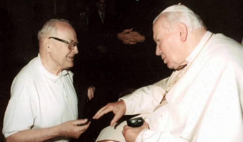 Silvester Krčméry sa priatelil so svätým Jánom Pavlom II. Toto priateľstvo vzniklo "náhodou dobre riadenou zhora". Ján Pavol II. dokonca Silvestrovi Krčmérymu udelil Rad sv. Silvestra. Snímka: reprofoto z publikácie Františka Neupauera Silvo Krčméry, Bratislava, Nenápadní hrdinovia, 2012.