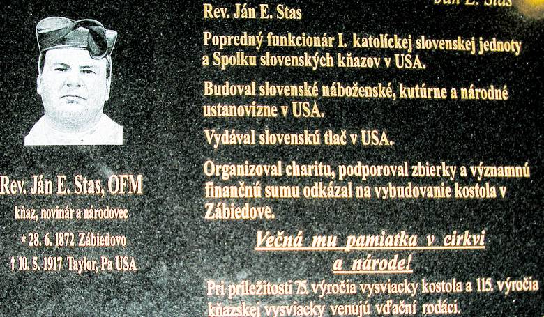 Rímskokatolícky kostol, ktorý sa vypína nad obcou, bol vybudovaný z jeho finančného daru. Ján Stas sa narodil 28. júna 1872 v Zábiedove, kde navštevoval aj prvý ročník ľudovej školy. Základné vzdelanie a gymnázium ukončil v Žiline a po vstupe do rádu sv. Františka pokračoval v štúdiu v Beckove, Hlohovci a Kremnici.